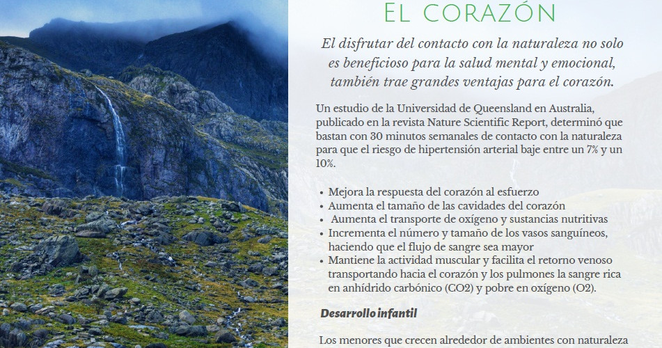 Es evidente que la naturaleza es fuente de conocimiento y belleza, algo muy importante e indispensable en la vida del ser humano. Aunque las bondades de la naturaleza no quedan ahí, debido a que la naturaleza nos ofrece un sin número de beneficios para la nuestra salud, tanto física como mental: